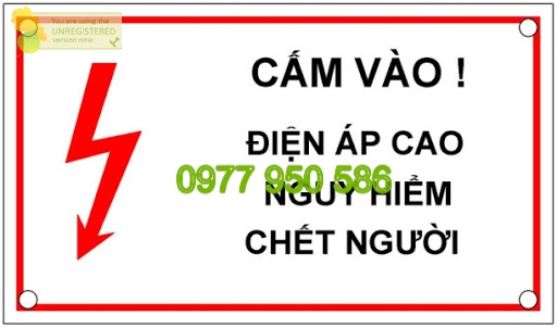 Đặc điểm: Hình chữ nhật, nền trắng, viền đỏ, hình tia điện màu đỏ, chữ màu đen